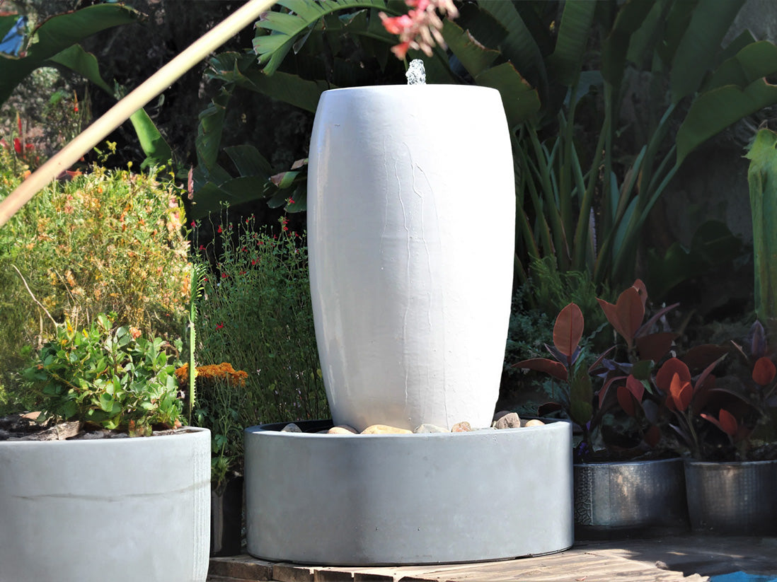 The fountain comes in Orange, White, Green Stream, Falling Aqua, and Matte Black to match outdoor and interior environments. It is 20.0 inches in diameter and 35.0 inches tall, making it a striking focus point in any garden or patio.