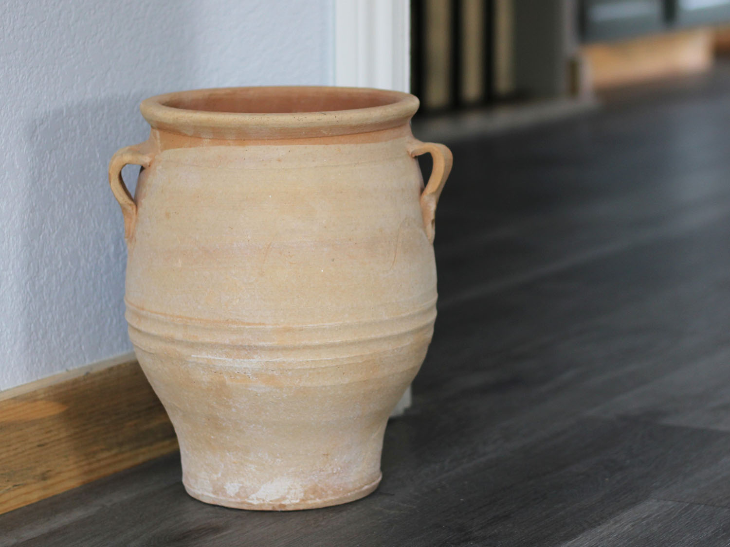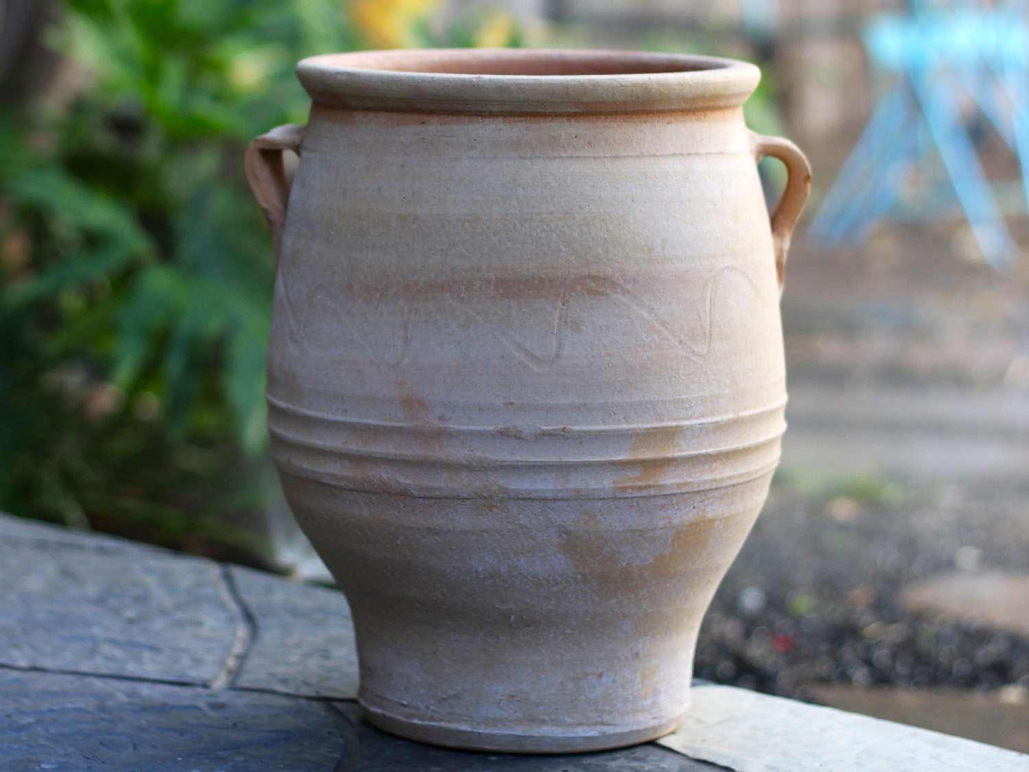 Pitharaki Urn – an ancient piece from Crete. These Greek pottery planters add a real traditional feel to your decor. Each of the urns is unique and these handcrafted plant pots are made with the finest Cretan clay. These vintage-style outdoor clay pots offer traditional vibes instantly transporting you to the Mediterranean era.