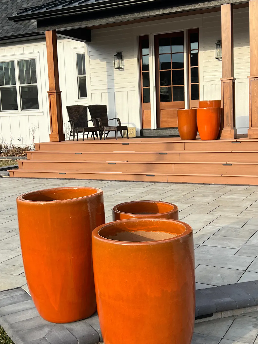 Standing at 32.5 inches tall with a 22-inch diameter, these planters make a bold statement, offering ample space for a variety of plants—from shrubs to cascading greens. The vibrant color palette includes Orange White Silver Rock, Green Stream, Falling Blue, Falling Aqua, Canary Yellow, Lavish Red, and Matte Black, allowing you to choose the perfect hue to complement your outdoor décor.